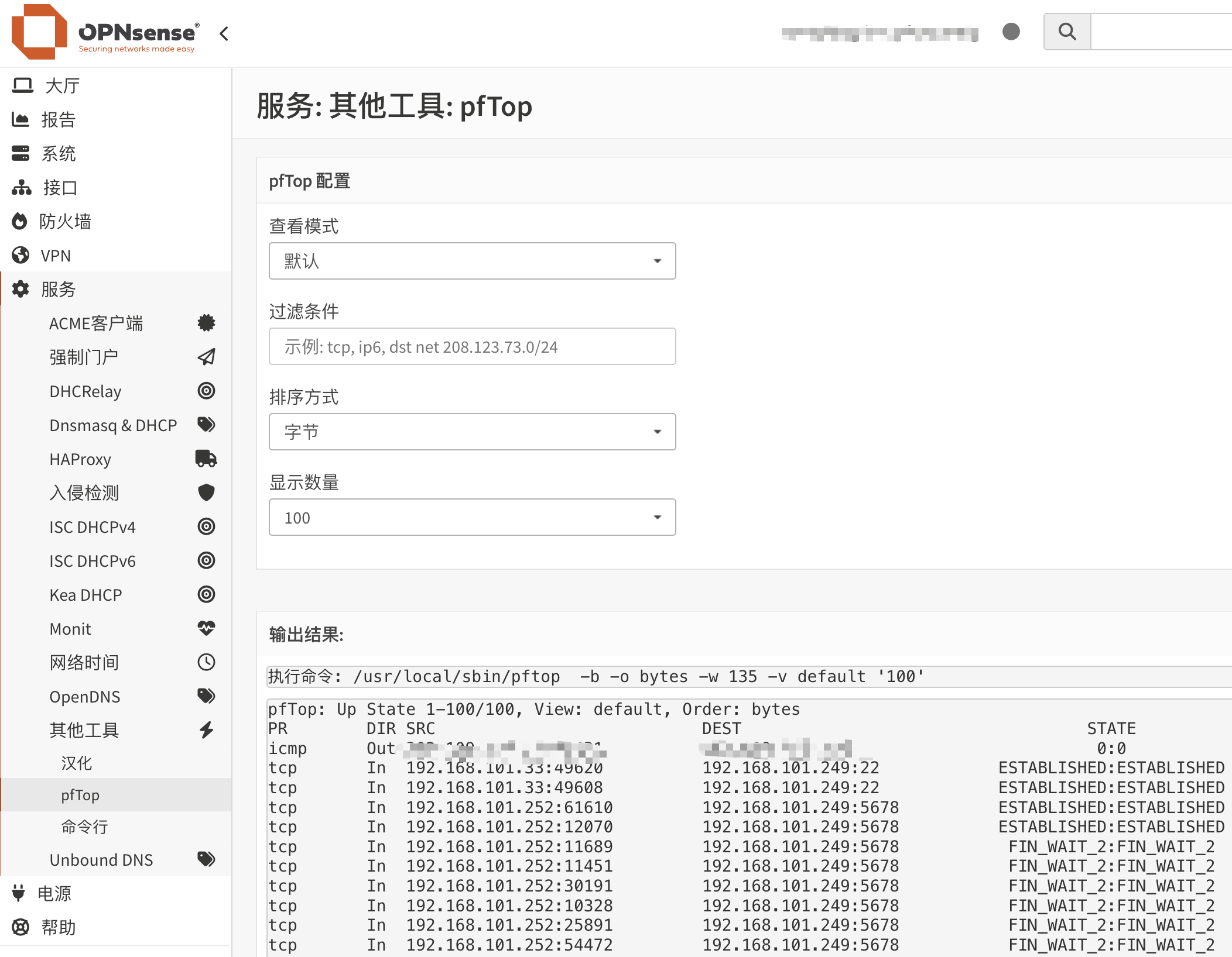 - pftop:实时监控和显示防火墙的流量和连接状态,使用方法请参考pfSense防火墙pftop命令行工具使用教程。
