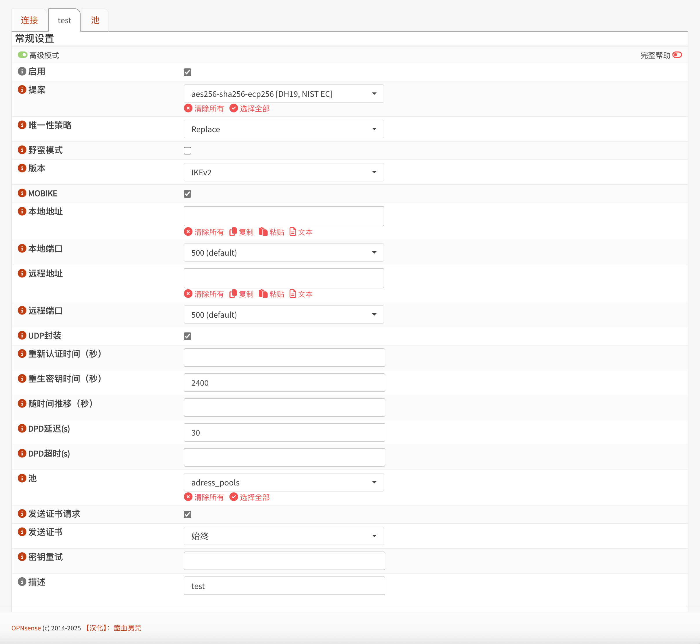 OPNsense新版本使用了全新的IPsec配置界面,配置过程与旧版本存在较大差异。本文介绍使用EAP-MSCHAPv2认证配置IKEv2远程访问的方法,EAP-TLS认证请自行测试。