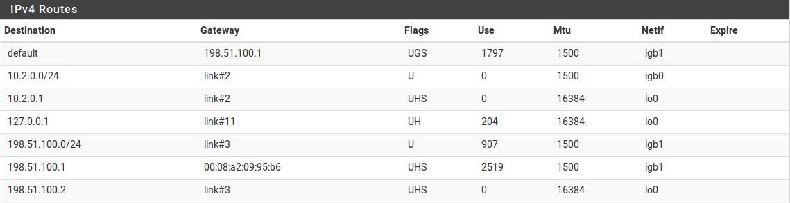 # netstat -rWn Routing tables Internet: Destination Gateway Flags Use Mtu Netif Expire default 198.51.100.1 UGS 1822 1500 igb1 10.2.0.0/24 link#2 U 0 1500 igb0 10.2.0.1 link#2 UHS 0 16384 lo0 127.0.0.1 link#11 UH 204 16384 lo0 198.51.100.0/24 link#3 U 1181 1500 igb1 198.51.100.1 00:08:a2:09:95:b6 UHS 2789 1500 igb1 198.51.100.2 link#3 UHS 0 16384 lo0