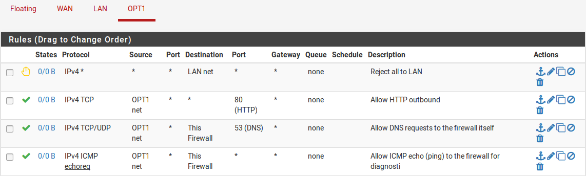 NAT和IP地址配置现在已完成。 需要添加防火墙规则以允许出站和入站流量。 下图显示了类似DMZ的配置,其中所有去往LAN子网的流量都被拒绝,允许DNS和ping到OPT1接口IP地址,并允许HTTP出站。