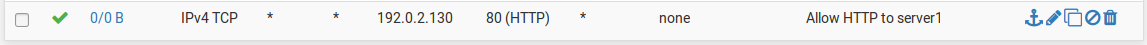 要允许来自Internet的流量到达内部接口上的公共IP地址,请使用公共IP地址作为目标在WAN上添加规则。 图WAN防火墙规则显示了一个允许HTTP到192.0.2.130的规则,这是内部接口上的公共IP地址之一。