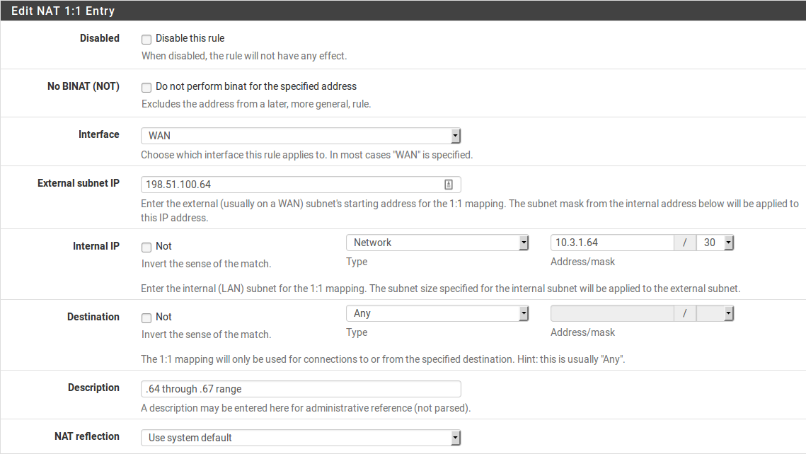 选择最后一个字节匹配的寻址方案使得布局更容易理解并维护。下图为1:1NAT配置为一个/ 30 CIDR范围的IP。
