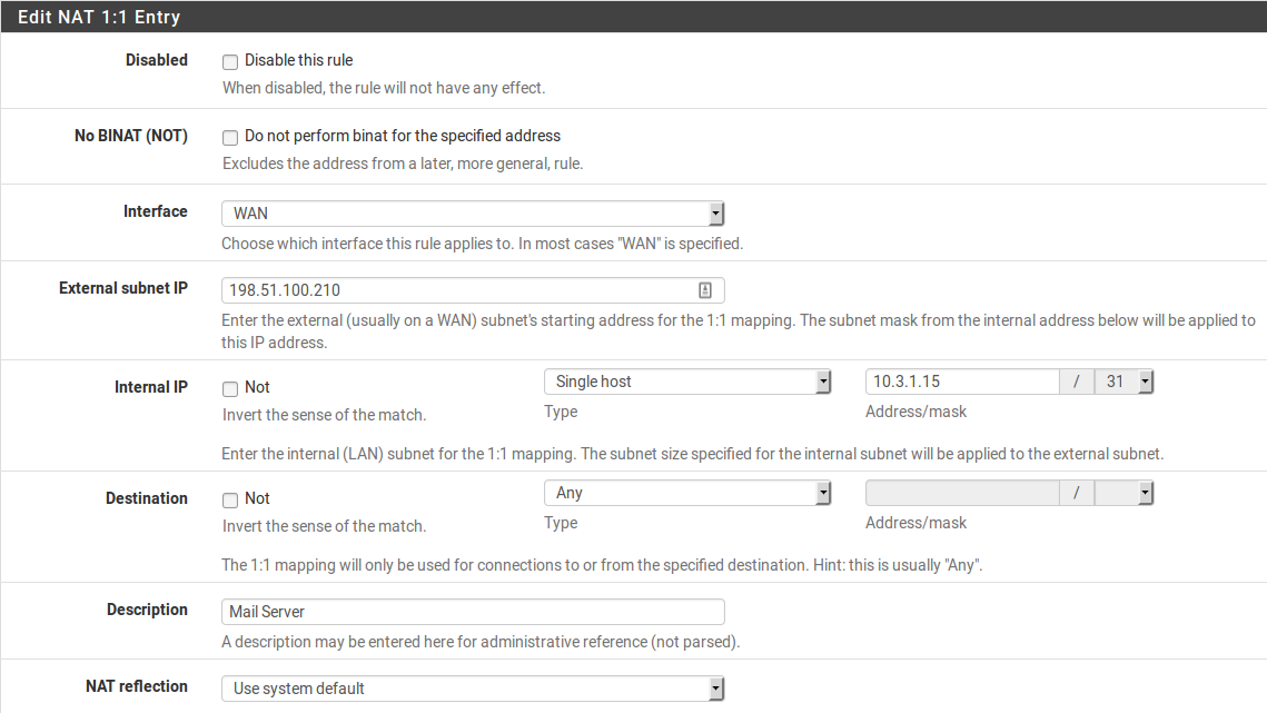 在本例中,198.51.100.210是WAN接口上的虚拟IP地址。 在大多数部署中,这将被工作的公共IP地址替代。 该映射中的邮件服务器驻留在使用内部IP地址10.3.1.15的DMZ段中。 如下图所示。