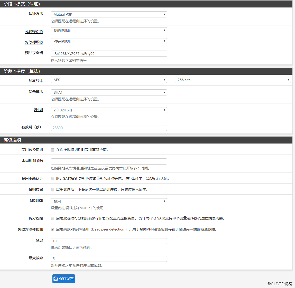 下一步继续设置IPsec阶段1。 对于大多数设置,使用默认值就可以了。