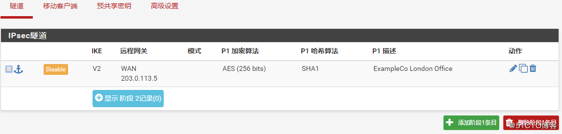 - 单击 显示阶段2条目,如下图所示,展开这个VPN阶段2的列表。