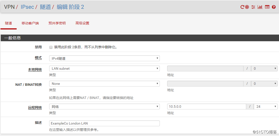 远程子网: 输入站点B的网络, 在这里为10.5.0.0/24。