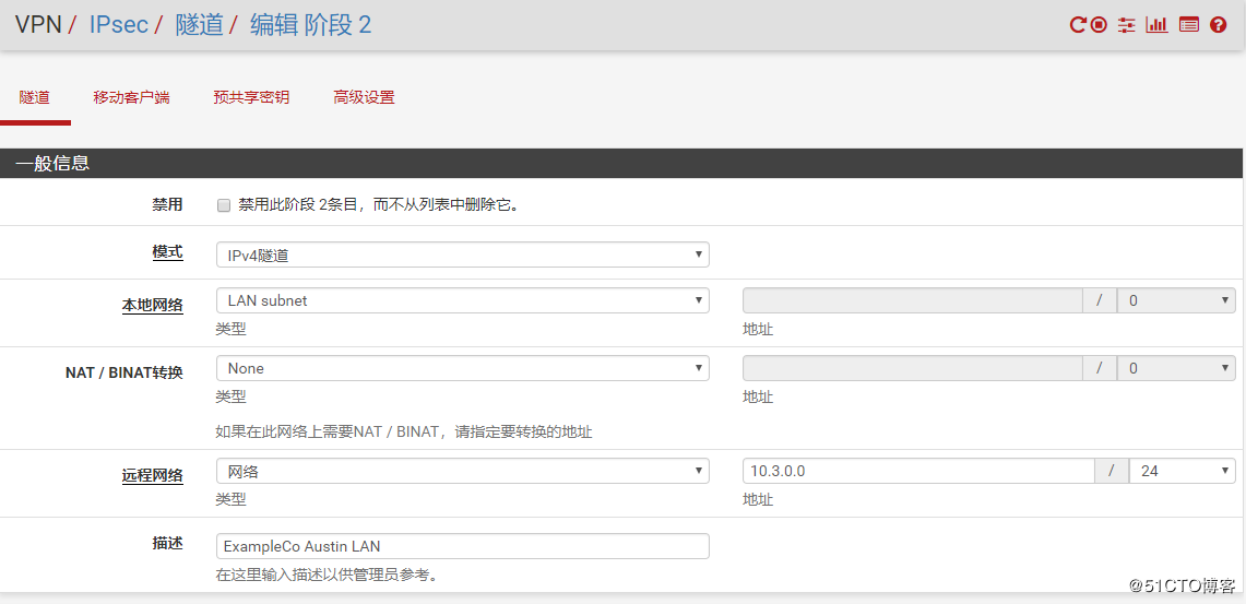 本地子网:最好选为LAN Subnet,但是也可以把它改成Network,填入正确的子网值,在这个例子中是10.3.0.0/24。 将其保留为LAN Subnet将确保如果网络重新编号,隧道的这一端将随之更改。 如果发生这种情况,则必须手动更改另一端。