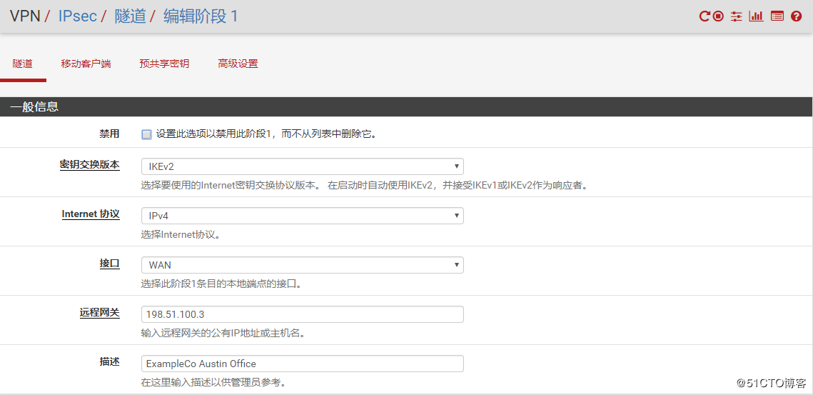 远程网关:输入站点A的WAN地址: 198.51.100.3