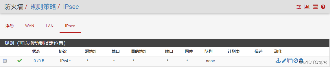 站点A的隧道已经完成,现在需要设置防火墙规则来允许来自站点B的网络流量通过IPsec隧道进入。 这些规则必须添加到防火墙规则下的IPsec选项卡中。 可以根据需要放宽(允许从任何地方到任何地方的任何协议)或限制性的(允许站点B上的特定主机到特定端口上的站点A的特定主机的TCP)。 在这种情况下,确保源地址是站点B地址,例如10.5.0.0/24。 目标地址将是站点A网络,10.3.0.0/24。