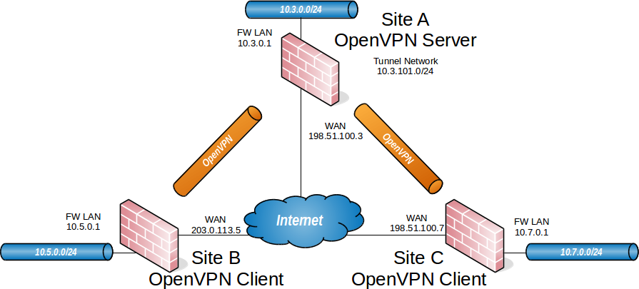 当使用SSL / TLS配置站点到站点OpenVPN连接时,一个防火墙将成为服务器,其他防火墙将成为客户端。通常情况下,主要位置是服务器端,远程办公室将充当客户端,但是如果一个位置具有比主办公室更多的静态IP地址和更多带宽,那么应该是服务器更理想的位置。除了两端的子网之外,还有一个专用子网用于网络之间的OpenVPN互连。
