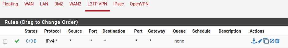 在某些情况下,例如与IPsec结合使用时,L2TP流量也可能需要通过浮动规则进行特殊处理。 在防火墙日志中出站方向上显示为阻止的流量,会显示为L2TP服务器接口。如果发生这种情况,请按如下所示添加浮动规则: