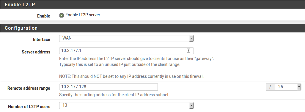在当前版本的pfSense上,可以为移动客户端配置L2TP / IPsec,但这不是我们推荐的配置。